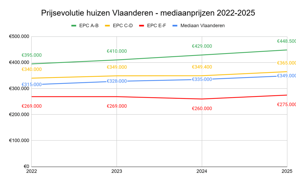- Druk op EPC E-F: Het segment met de laagste energie-efficiëntie presteert beduidend minder. De prijs steeg hier slechts van €269.000 in 2022 naar €275.000 in 2025, een beperkte toename van 2,2%. Deze bleven dus nagenoeg stabiel.